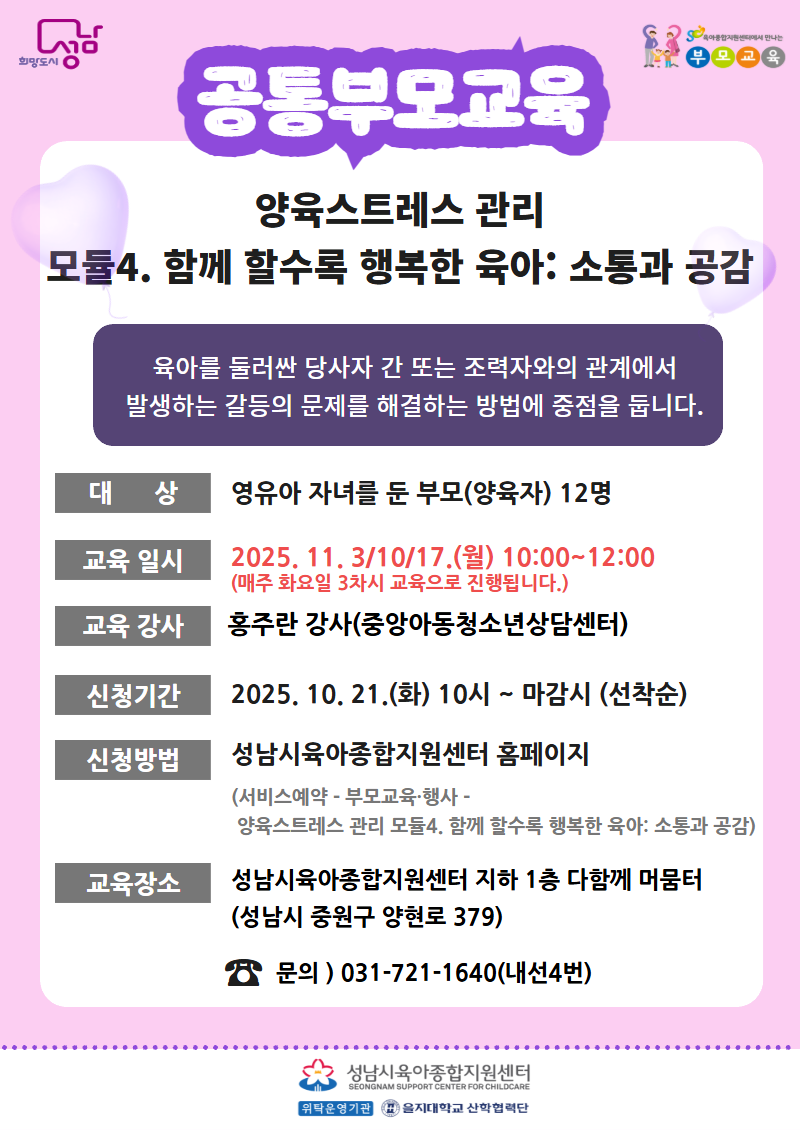 <![CDATA[집단상담프로그램) '2025년 함께 할수록 행복한 육아 : 소통과 공감'_성남시]]> 안녕하세요?